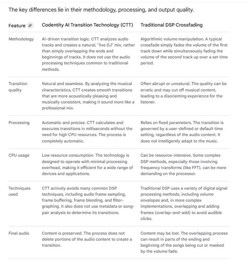With that said, the Codentity information collected here on 9/7/2025 and presented in the table above is almost 100% accurate. The sole exception is this: Codentity AI Transition Technology does not analyze the "musical characteristics" of the audio files (i.e., the songs) when implementing a transition.